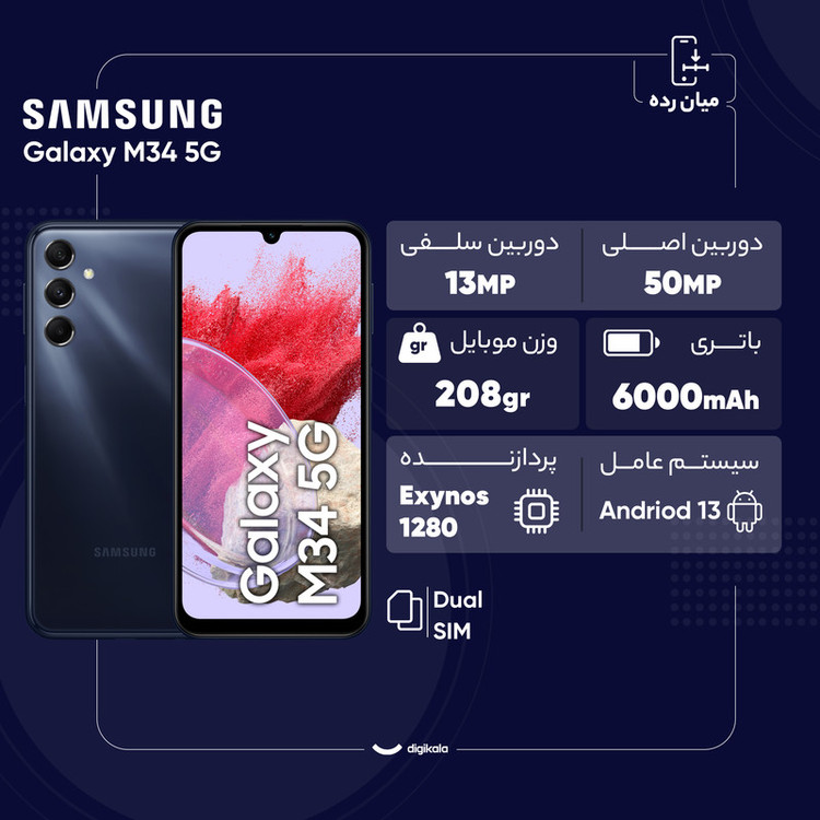 گوشی موبایل سامسونگ مدل Galaxy M34 5G دو سیم کارت ظرفیت 128 گیگابایت و رم 6 گیگابایت
