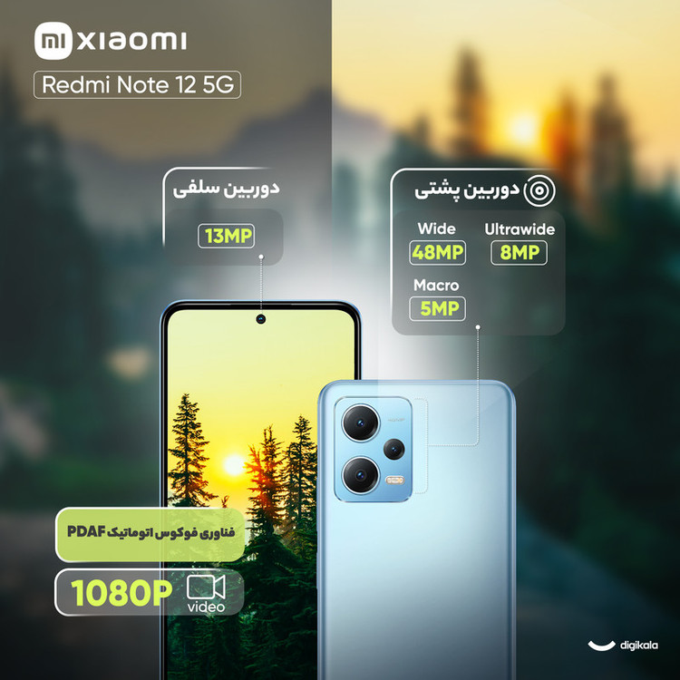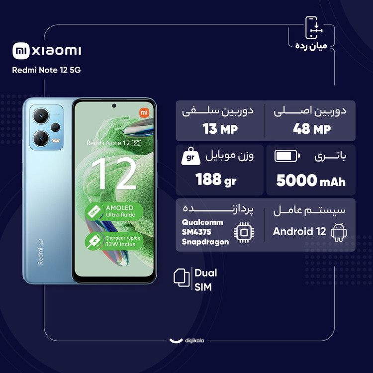 گوشیRedmi Note 12 5G از سری میانردههای محبوب شیائومی است که با طراحی جذاب، سختافزار قدرتمند و قابلیتهای مدرن، تجربهای فراتر از انتظار را به کاربران ارائه میدهد. حسگر اثر انگشت در لبه کناری گوشی طراحی شده تا دسترسی سریع و امنی داشته باشید. این گوشی با پشتیبانی از فناوری 5G، تراشهSnapdragon 4 Gen و پردازنده گرافیکیAdreno 619 همراه با ۸ گیگابایت رم، عملکرد سریع و روان در اجرای برنامهها و بازیها را تضمین میکند. طراحی باریک و وزن 188 گرمی این گوشی، آن را برای استفاده روزمره بسیار خوشدست کرده است. صفحه نمایش 6.67 اینچیAMOLED با نرخ تازهسازی 120 هرتز و روشنایی 1200 نیت، تجربهای بینظیر در تماشای فیلم، بازی و استفاده از اپلیکیشنها به شما ارائه میدهد. محافظ Corning Gorilla Glass 3 از صفحه نمایش در برابر خط و خش محافظت میکند. دوربین اصلی ۴۸ مگاپیکسل و با لنز عریض ساخته شدهاست. دوربین دوم ۸ مگاپیکسل و فوق عریض طراحی شدهاست. دوربین سوم هم با ۲ مگاپیسل لنز ماکرو در این گوشی شیائومی تعبیه شدهاست. دوربین سلفی 13 مگاپیکسلی این گوشی هم برای تماسهای ویدیویی و عکسهای پرتره عملکرد خوبی ارائه میدهد. گوشی شیائومیRedmi Note 12 5G ترکیبی از طراحی زیبا، عملکرد قوی، دوربینهای کاربردی و باتری پرقدرت است. این دستگاه برای کاربرانی که به دنبال یک گوشی میانرده با قابلیتهای مدرن هستند، انتخابی ایدهآل خواهد بود.