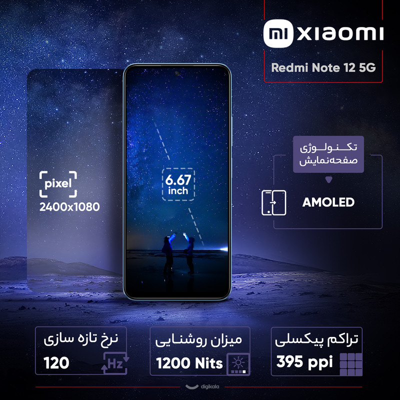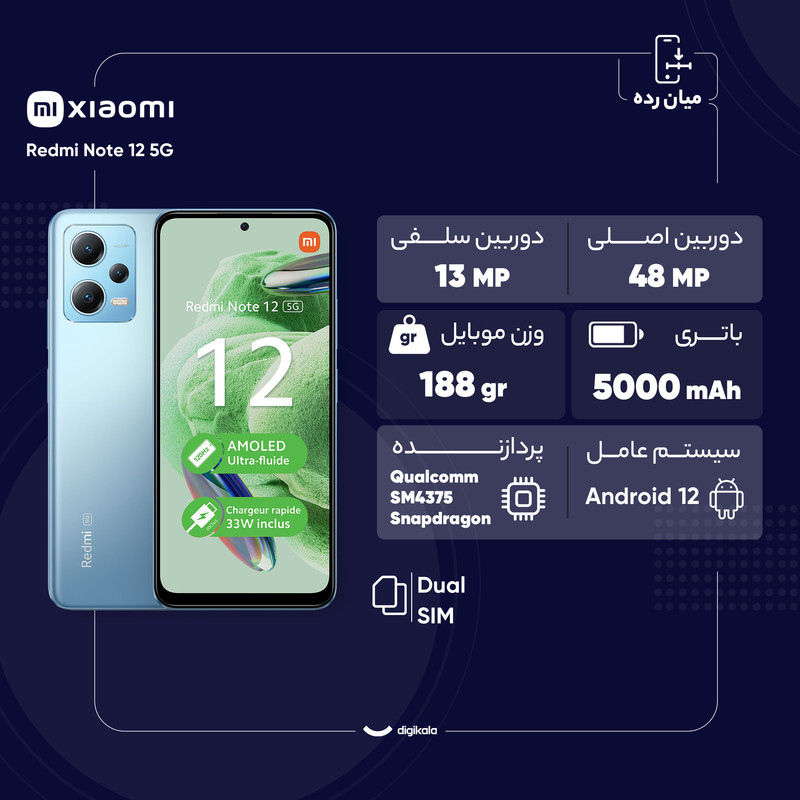 گوشیRedmi Note 12 5G از سری میانردههای محبوب شیائومی است که با طراحی جذاب، سختافزار قدرتمند و قابلیتهای مدرن، تجربهای فراتر از انتظار را به کاربران ارائه میدهد. حسگر اثر انگشت در لبه کناری گوشی طراحی شده تا دسترسی سریع و امنی داشته باشید. این گوشی با پشتیبانی از فناوری 5G، تراشهSnapdragon 4 Gen و پردازنده گرافیکیAdreno 619 همراه با ۸ گیگابایت رم، عملکرد سریع و روان در اجرای برنامهها و بازیها را تضمین میکند. طراحی باریک و وزن 188 گرمی این گوشی، آن را برای استفاده روزمره بسیار خوشدست کرده است. صفحه نمایش 6.67 اینچیAMOLED با نرخ تازهسازی 120 هرتز و روشنایی 1200 نیت، تجربهای بینظیر در تماشای فیلم، بازی و استفاده از اپلیکیشنها به شما ارائه میدهد. محافظ Corning Gorilla Glass 3 از صفحه نمایش در برابر خط و خش محافظت میکند. دوربین اصلی ۴۸ مگاپیکسل و با لنز عریض ساخته شدهاست. دوربین دوم ۸ مگاپیکسل و فوق عریض طراحی شدهاست. دوربین سوم هم با ۲ مگاپیسل لنز ماکرو در این گوشی شیائومی تعبیه شدهاست. دوربین سلفی 13 مگاپیکسلی این گوشی هم برای تماسهای ویدیویی و عکسهای پرتره عملکرد خوبی ارائه میدهد. گوشی شیائومیRedmi Note 12 5G ترکیبی از طراحی زیبا، عملکرد قوی، دوربینهای کاربردی و باتری پرقدرت است. این دستگاه برای کاربرانی که به دنبال یک گوشی میانرده با قابلیتهای مدرن هستند، انتخابی ایدهآل خواهد بود.