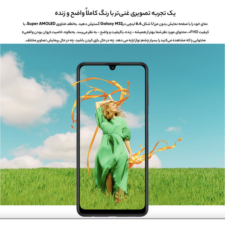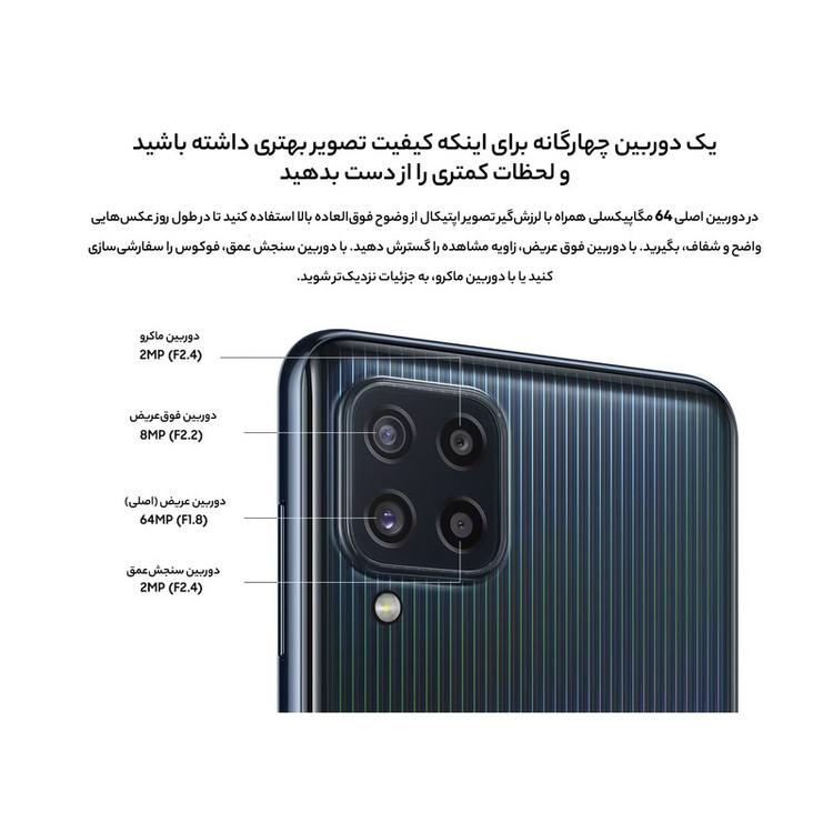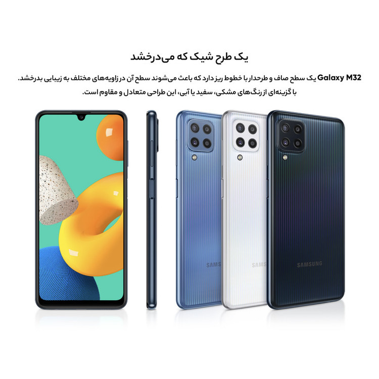 سامسونگ Galaxy M32 یکی از گوشیهای هوشمند میانرده این شرکت است که با توجه به بهره بردن از مشخصات فنی مناسب، میتواند عملکرد بسیار خوب و قابل قبولی داشته باشد. در برخی از موارد، مشخصات در نظر گرفته شده برای این گوشی، دست کمی از یک پرچمدار ندارد. Galaxy M32 به صفحهنمایش با ابعاد 6.4 اینچ و رزولوشن 1080×2400 پیکسل از نوع سوپرامولد مجهز شده است. صفحهنمایش باکیفیتی که توانایی ارائه نرخ بروزرسانی 90 هرتز را دارد. در قسمت پشتی هم چهار سنسور دوربین برای این گوشی در نظر گرفته شده است. یک سنسور دوربین اصلی قدرتمند با رزولوشن 64 مگاپیکسل از نوع عریض با گشودگی دریچه دیافراگم f/1.8 در کنار سنسور 8 مگاپیکسل از نوع فوق عریض (ultra wide) و دو سنسور با رزولوشن 2 مگاپیکسل از نوع ماکرو و سنجش عمق، سنسورهای دوربین چهارگانه Galaxy M32 را تشکیل میدهند. برای دوربین سلفی هم سنسور قدرتمند با رزولوشن 20 مگاپیکسل در نظر گرفته شده است. در بخش مشخصات سختافزاری هم این گوشی به پردازنده میانرده هلیو G80 شرکت مدیاتک (Mediatek Helio G80) مجهز شده است. همانند اکثر گوشیهای هوشمند میانرده سری M، این گوشی هم به باتری قدرتمند با میزان ظرفیت 5000 میلیآمپرساعت در کنار شارژر 25 وات (پشتیبانی از فناوری شارژ سریع) مجهز شده است. گوشیهای اکتیو هم به این شکل هستند که به دلیل محدودیتهای برخی از محصولات برای کشور ایران، در کشورهای همسایه بهصورت رسمی با یک بار قرار گرفتن سیمکارت، اکتیو شده تا امکان استفاده در کشور وجود داشته باشد و پلمپ میشوند و باید بدانید که این پروسه هیچ مشکلی در راستای گارانتی کالا بههمراه ندارد.