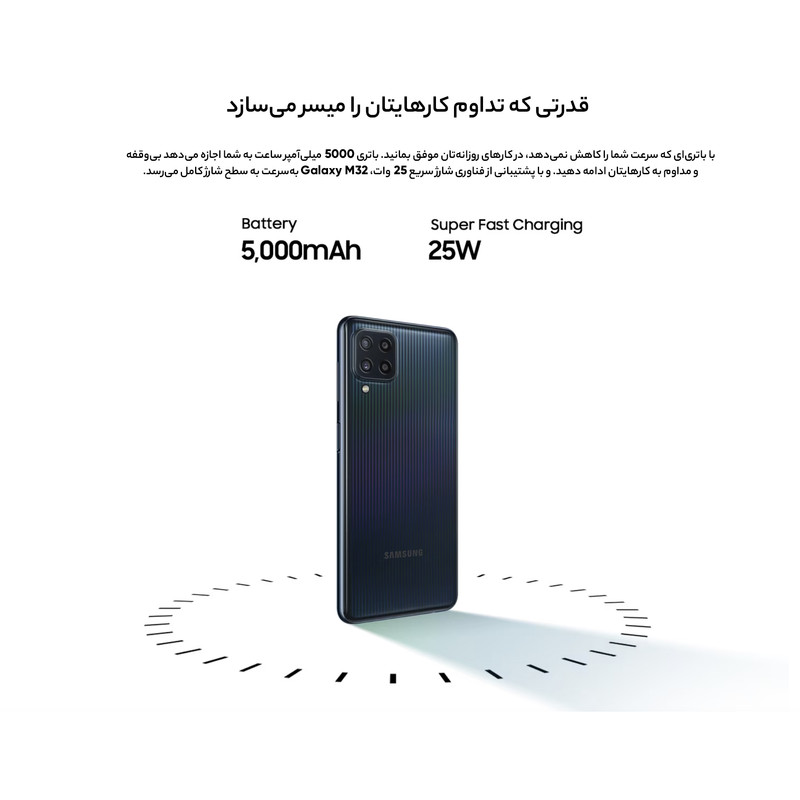 سامسونگ Galaxy M32 یکی از گوشیهای هوشمند میانرده این شرکت است که با توجه به بهره بردن از مشخصات فنی مناسب، میتواند عملکرد بسیار خوب و قابل قبولی داشته باشد. در برخی از موارد، مشخصات در نظر گرفته شده برای این گوشی، دست کمی از یک پرچمدار ندارد. Galaxy M32 به صفحهنمایش با ابعاد 6.4 اینچ و رزولوشن 1080×2400 پیکسل از نوع سوپرامولد مجهز شده است. صفحهنمایش باکیفیتی که توانایی ارائه نرخ بروزرسانی 90 هرتز را دارد. در قسمت پشتی هم چهار سنسور دوربین برای این گوشی در نظر گرفته شده است. یک سنسور دوربین اصلی قدرتمند با رزولوشن 64 مگاپیکسل از نوع عریض با گشودگی دریچه دیافراگم f/1.8 در کنار سنسور 8 مگاپیکسل از نوع فوق عریض (ultra wide) و دو سنسور با رزولوشن 2 مگاپیکسل از نوع ماکرو و سنجش عمق، سنسورهای دوربین چهارگانه Galaxy M32 را تشکیل میدهند. برای دوربین سلفی هم سنسور قدرتمند با رزولوشن 20 مگاپیکسل در نظر گرفته شده است. در بخش مشخصات سختافزاری هم این گوشی به پردازنده میانرده هلیو G80 شرکت مدیاتک (Mediatek Helio G80) مجهز شده است. همانند اکثر گوشیهای هوشمند میانرده سری M، این گوشی هم به باتری قدرتمند با میزان ظرفیت 5000 میلیآمپرساعت در کنار شارژر 25 وات (پشتیبانی از فناوری شارژ سریع) مجهز شده است. گوشیهای اکتیو هم به این شکل هستند که به دلیل محدودیتهای برخی از محصولات برای کشور ایران، در کشورهای همسایه بهصورت رسمی با یک بار قرار گرفتن سیمکارت، اکتیو شده تا امکان استفاده در کشور وجود داشته باشد و پلمپ میشوند و باید بدانید که این پروسه هیچ مشکلی در راستای گارانتی کالا بههمراه ندارد.
