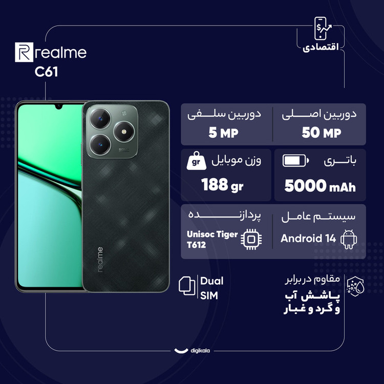 گوشی ریلمی C61، یکی از محصولات اقتصادی و خوشقیمت این برند، در جولای 2024 معرفی شد. این گوشی با طراحی باریک، وزن 188 گرمی، و بدنهای ساختهشده از شیشه در جلو و پلاستیک در فریم و قاب پشتی، در کنار استاندارد IP54 برای مقاومت در برابر گردوغبار و پاشش آب، جذابیت ویژهای دارد و گوشی خوش ساختی محسوب میشود. نمایشگر 6.74 اینچی IPS LCD این دستگاه با نرخ بروزرسانی 90 هرتز و روشنایی 560 نیت، تجربهای روان و قابل قبول را در کاربری روزمره ارائه میدهد. در بخش سختافزار، پردازنده Unisoc Tiger T612 همراه با پشتیبانی از کارت حافظه microSD، عملکردی مناسب برای کاربران عادی دارد. ریلمی C61 در بخش دوربین نیز با سنسور اصلی 50 مگاپیکسلی و قابلیتهای HDR و پانوراما، عکسهایی باکیفیت قابل قبول ثبت میکند. همچنین، باتری قدرتمند 5000 میلیآمپرساعتی با پشتیبانی از شارژ 15 واتی، دوام مناسبی را در طول روز فراهم میکند. این گوشی با سیستمعامل Android 14 و رابط کاربری Realme UI ارائه شده است و بهروزرسانیهای جدید را نیز پشتیبانی میکند. در مجموع ریلمی C61، گزینهای مناسب برای کسانی است که به دنبال گوشیای مقرونبهصرفه با امکانات کاربردی هستند.